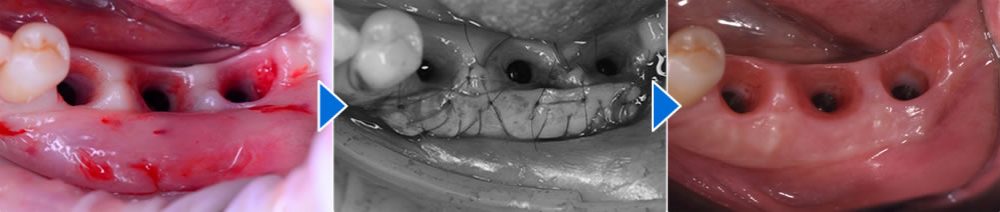 保存不可能な歯を抜歯した後、即時にインプラントを埋入しました。抜歯部分は骨量の減少も著しかったため、歯周組織の再生を促進するPRP(多血小板血漿)を同時に行いました。