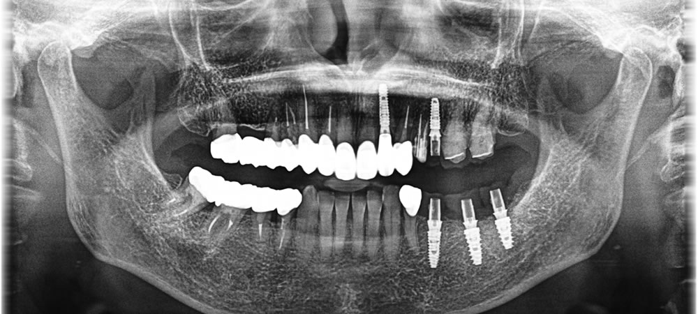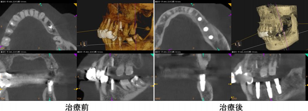 診査・診断の結果、全体的に咬合状態が悪くなっていることが分かりました。患者さまと相談し、保存不可能な歯を抜歯後、インプラントなどによって上下の咬合状態を改善する計画を立てました。