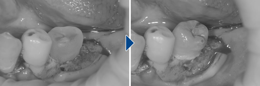 こちらは、保存不可能な歯を抜歯後に親知らずを移植して咬み合わせを改善した症例です。